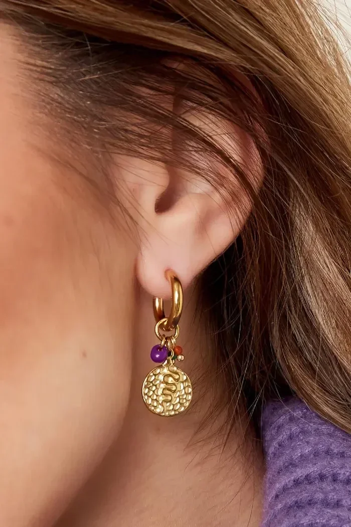 Shop deze gouden oorbellen met ronde bedel en paars, groene en oranje kraaltjes nu bij Yehwang! Deze oorbellen zijn gemaakt van stainless steel in combinatie met steentjes en glaskralen. Een perfecte oorbel die het hele jaar door gedragen kan worden! Oorbellen met ronde bedel slang zijn verkrijgbaar in de kleuren goud en zilver en hebben een afmeting van 3,2 cm! Erg leuk om deze oorbellen met meerdere gouden oorbellen te combineren om een sierlijke ear party te creëren.